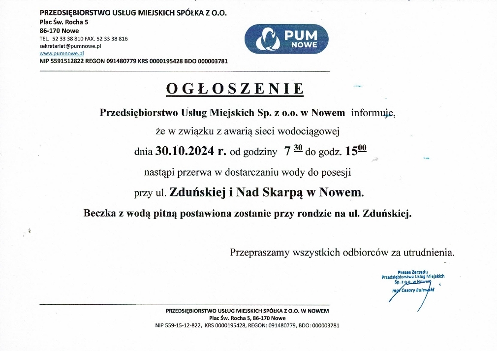 Przerwa w dostarczaniu wody - ul. Zduńska i Nad Skarpą - 30.10.2024
